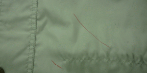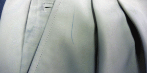 ズボンンのポケットの横にスジ状のボールペンのインクが付いてい …