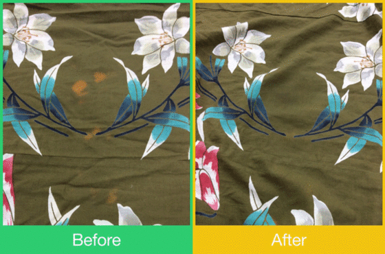浴衣の後ろの所なのですが、数カ所変色しています、お気に入りの浴衣なのですが、これではさすがに着れないとのことで染色補正をさせてもらいました。
