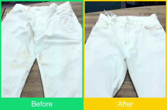 ズボンにミートソースが飛び散ったので、家庭で今売り出し中の洗剤で洗ったのですが取れなかったとのことでお持ちいただきました。