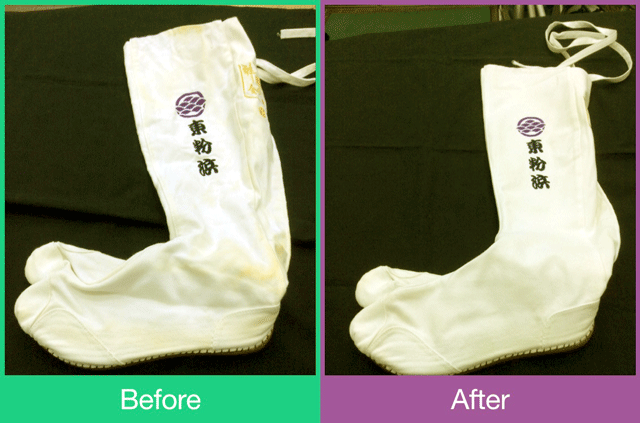 底がゴムになっていて、上の部分は綿の布を使用してタビのように作られている鳶の方専用の地下足袋なのですが、自分で洗われた後にゴム底の部分に布の所を重ねて置いていたらゴムの色がついたとのことでお持ちいただきました。
