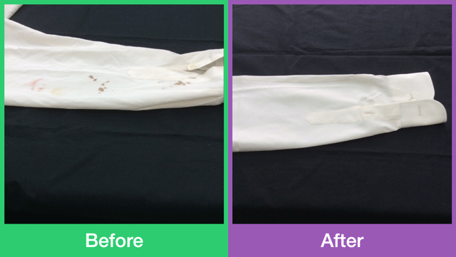 ですが1年や10年と時間が過ぎますと上記のようなしみ抜きでは取れなく、タンパク分解酵素などを使用して血液を分解しながらのしみ抜きになり、時間もかかりしみ抜き料金も高額になります。