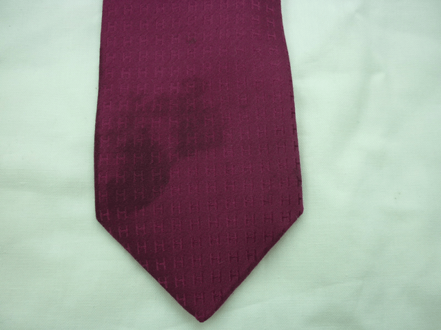 良くあわててぬれタオルやお手ふきなどで拭かれたりこすったりされることがありますが、そのようなことをネクタイなどの絹製品にされますと色あせしたり、生地が毛羽立って白っぽくなったりしますのでしないようにお願いしまい。