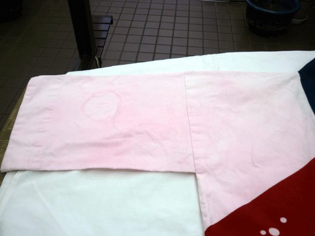 家庭洗濯されたときにハッピから色が出て本体に赤の染料が色移りしたとのことです。