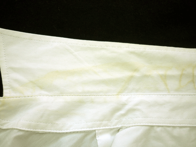 汗は衣類についたときは生地には何もシミになっていないように思われる方が多いようですが、時間の経過とともに汗が酸化され生地が黄ばんできます。
