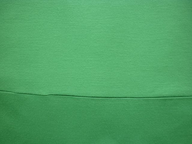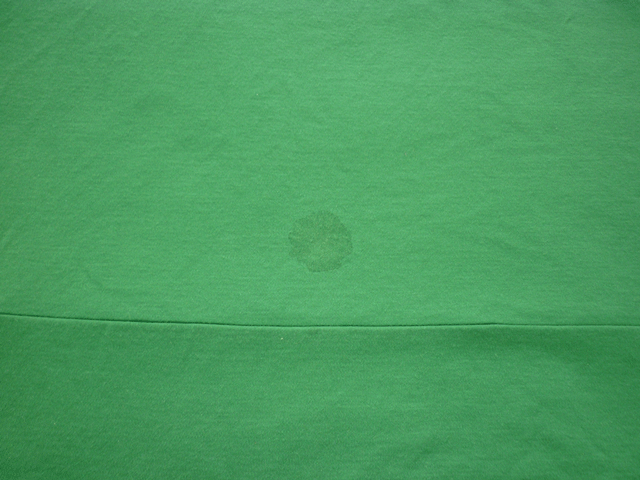 綿生地のニットなのですが鮮やかなグリーなので強くしみ抜きをしますと生地の色まで薄くなりますので頃合いを見ながらしみ抜きします。