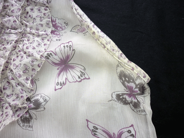シルクシフォンの生地でプリーツ加工してあり薄いグレー色の生地のしみ抜きは難易度がかなりあります。