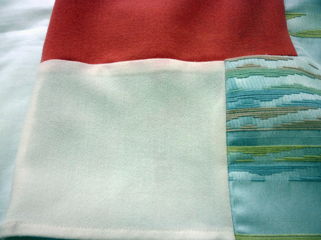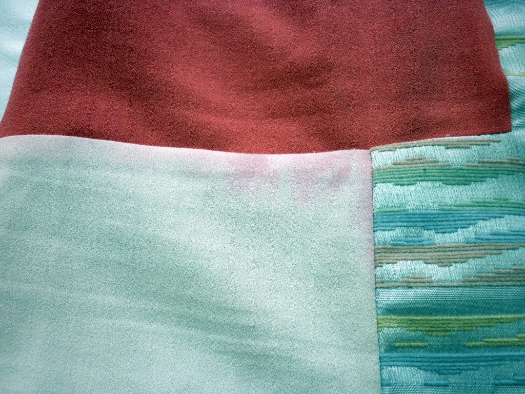 色柄でパチワーク風に仕立てたスカートなのですが、家庭洗濯され赤い色が色移りしたとのことでお持ちいただきました。