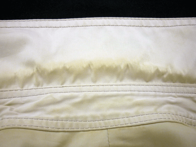 汗が衣類に付いたときは黄ばんでいませんが時間の経過とともに汗が酸化され黄ばみますので仕舞われる前には必ず汗ぬきの洗いをされますことをおすすめします。