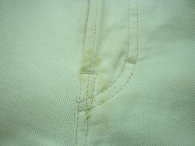 ズボンのファスナーのあたりに黄色いシミがありしみ抜きのご依頼です。