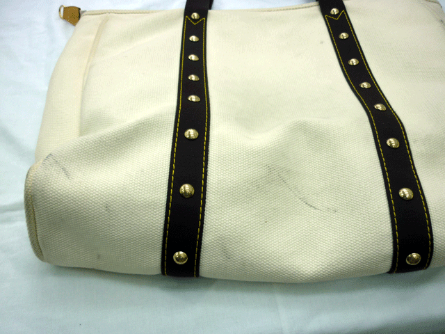 キャンバス地のトートバッグに黒い筋状のシミがあり全体も汚れているのでクリーニングもさせていただきました。