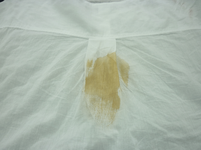 汗をかいている時に柱に背中をもたれさしたら木の柱の色がブラウスに移ったとのことでしみ抜きのご依頼です。
