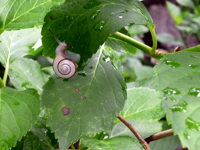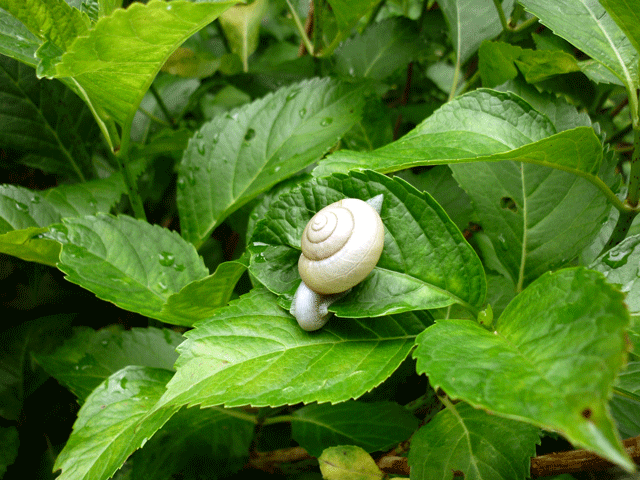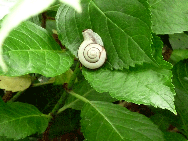 あじさいのある庭園を回っていますと、大阪市内ではあまり見なくなったカタツムリがあじさいの葉に止まっているのを見つけ思わず懐かしさがよみがえりあじさいよりカタツムリをさがしながらの回遊です。