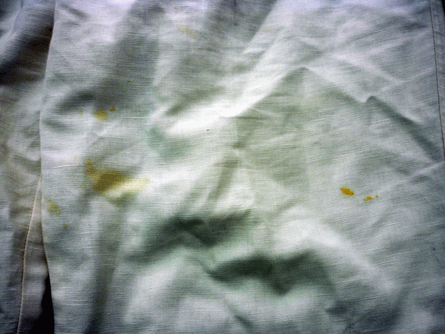 左足の真ん中あたりに黄色っぽいシミが数カ所ついています。