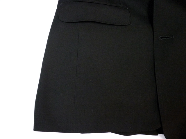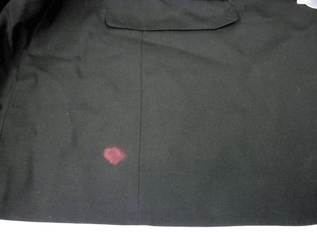 背広の前のポケットから万年筆のインクと思われるシミが表の生地までしみだしています。