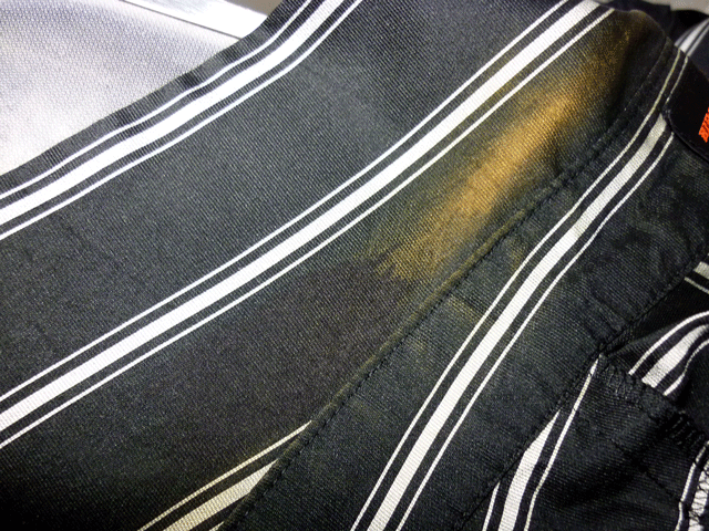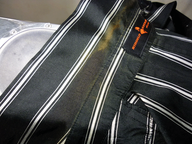 黒の部分の襟の所が茶色く変色しています。