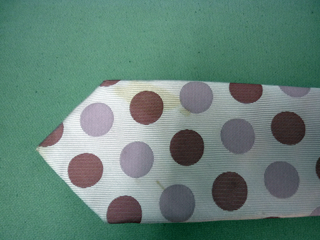 ネクタイの素材は絹がほとんどで、シミになりますと素材上あまり強くしみ抜き出来ませんので、早めの