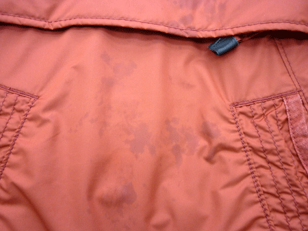 洗濯表示は手洗いになっています、たぶん手洗いで洗われたので油脂分が残ったのだと思われます。