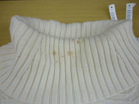 今回は、着用しようとクリーニングしたセーターを袋から出すと襟周りに黄色い