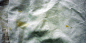 綿と麻混のズボンに黄色ぽいシミ。 左足の真ん中あたりに黄色っ …