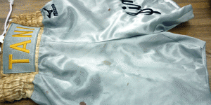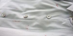スポーツシャツの袖に血液のようなしみ。 袖の所に血液のしみの …