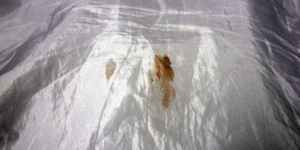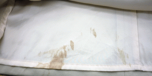 コートについた血液のしみです。 今回は吐血され、結構広範囲に …